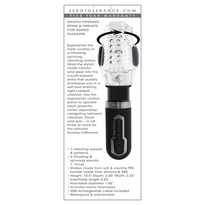 Experience the triple ecstasy of a thrusting, spinning, vibrating stroker.